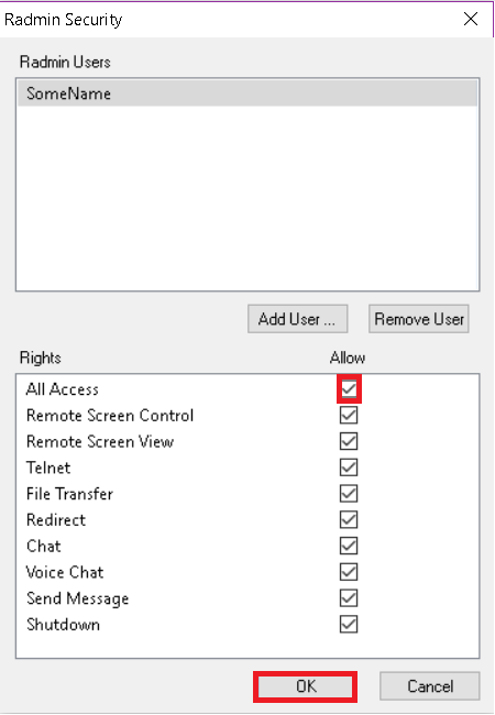 6. Agora você pode configurar os direitos de acesso para o usuário. Você precisa verificar pelo menos uma opção para permitir o acesso ao Servidor Radmin.